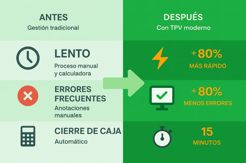 Después de implementar centenares de sistemas TPV, puedo decirte exactamente qué mejoras verás:
