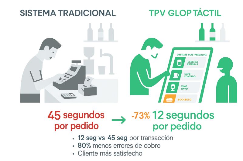 Velocidad real: Un camarero experimentado toma un pedido de 4 productos en 45 segundos con táctil vs 1.2 minutos con teclado numérico.
