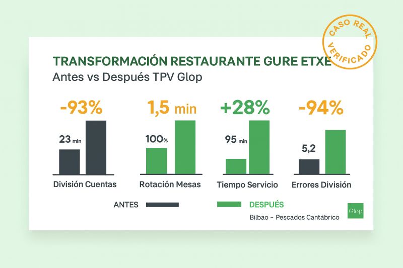 Después del TPV con división inteligente: Mikel ahora toca “Mesa 7” → “Dividir cuenta” → selecciona productos por persona → “Confirmar”. Total: 90 segundos para cualquier mesa, sin importar el número de comensales. Resultado: +28% en rotación de mesas grandes los fines de semana.